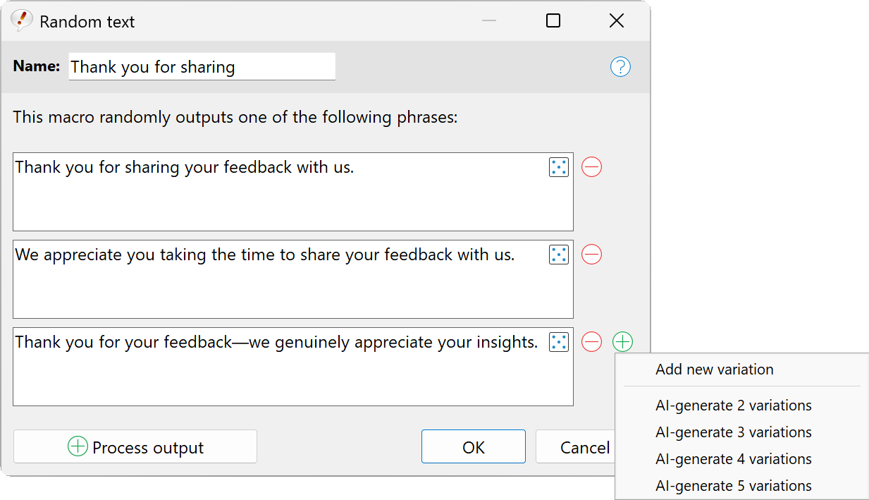 This macro function inserts one of the specified texts by random: