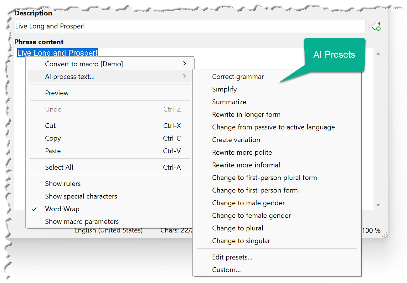 PhraseExpress comes with a selection of (customizable) presets to tweak your phrases with AI: