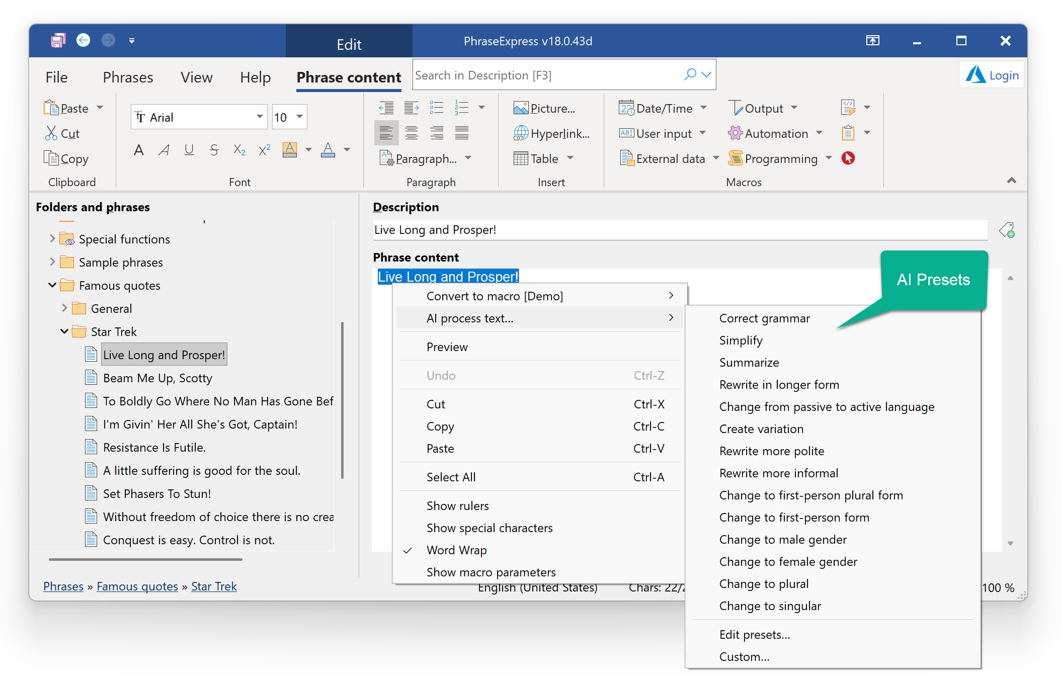 PhraseExpress comes with a selection of (customizable) presets to tweak your phrases with AI: