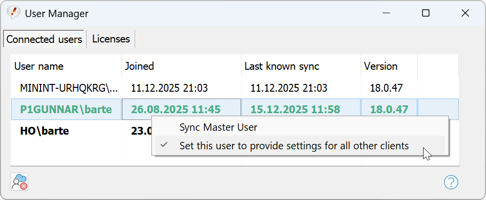 The user who set up the synchronization is the "master" user and highlighted in the user list in bold print.