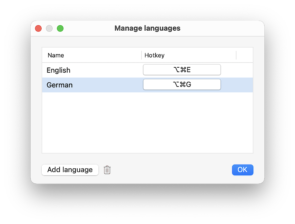 - Optionally, double-click in the hotkey input box to define a hotkey used later to switch to that language.