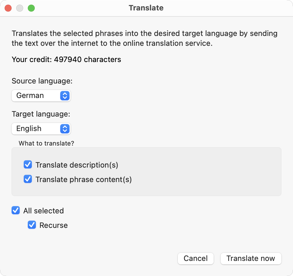 Phrase file export, offline caching, phrase search (and replace) and other editing functions are limited to the currently active language.
